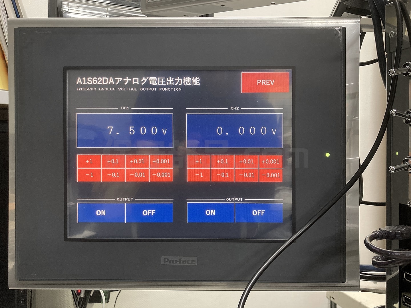 後半のアナログ入力ユニットの動作確認用のプログラムは少し複雑に見えますが、ch0~7のスケール変換を行っているだけです。たとえばアナログ入力ユニットに10Vの電圧を与えると、32,768というデジタル値になってしまうところを、1000となるように変換することで、動作確認をしやすく、また、不良を発見しやすくしています。