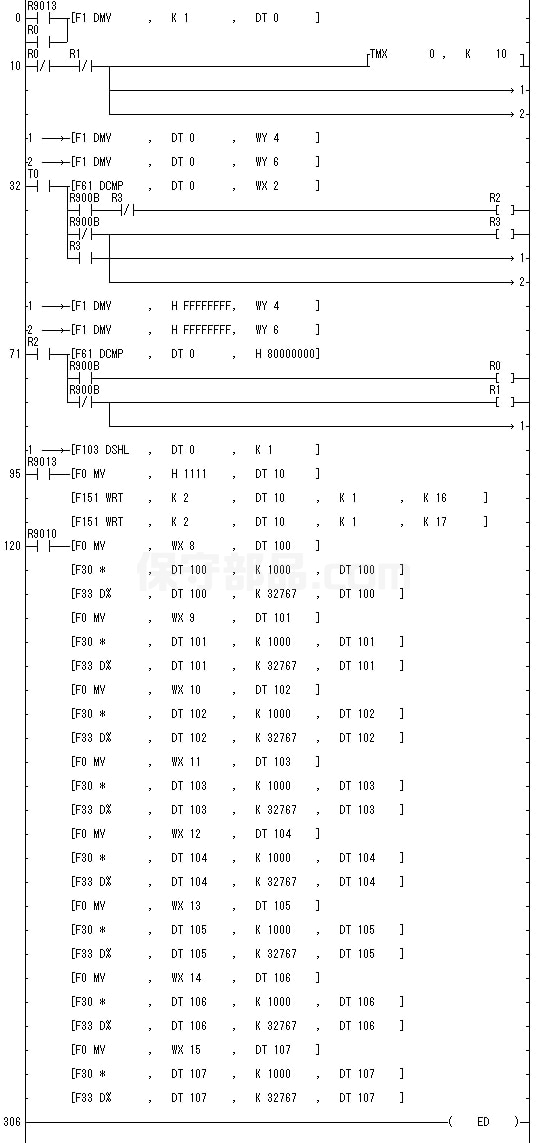 これは動作確認を行う際に実行させているプログラムです。前半が入出力ユニットの動作確認用、後半がアナログ入力ユニットの動作確認用となっています。このプログラムにおける入出力ユニットの動作確認方法は、出力を1点ずつ順次ONさせていき、入力、または、出力に異常があると全出力がON(出力ユニットのランプが全てON)し、停止するというものです。たとえばどれか1点がONしないとか、どれか1点がONしっぱなしになっているといった不具合を発見することができます。