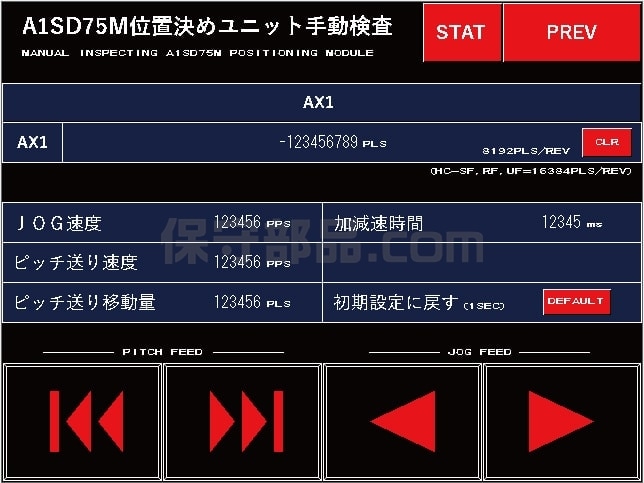 当社には独自開発の動作確認ソフトウェアがあります。MR-J2S-□Bは、高速シリアルバス通信(SSCNET)でコントロールする方式のアンプのため、そのソフトウェアの「A1SD75M位置決めユニット手動検査」という機能を使って動作確認をします。「ピッチ送り移動量」の設定を、サーボモータのエンコーダーの1回転あたりの分解能と同じ数値に設定し、正転及び逆転方向にそれぞれピッチ送りを何度も繰り返し行うことで正確な位置決め動作ができることを確認しています。