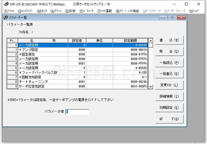 MR-J2S-□Bの型番のあとに何らかの記号が付くアンプは、特殊仕様のアンプです。メーカーがその顧客の要求仕様に合わせて予めパラメータを入力してあり、設定が変更ができないようになっている場合があります。特殊仕様のアンプはオークションサイトでよく見かけます。もし、特殊仕様のアンプをご購入なさった場合は、自由にパラメータの変更ができない場合がありますので注意が必要です。