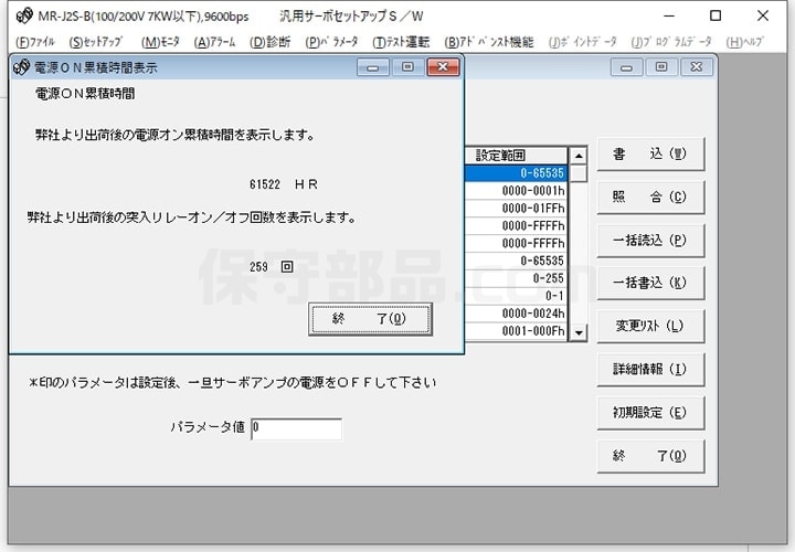 MR Configurator(セットアップソフトウェア)を用いて、正常にパラメータの読み書きができることも確認しています。なお、パラメータNo.40の「パラメータ書込み禁止」の設定が「000F」になっていない場合、「一括書込」を行っても、書き込み可能な範囲が限定されてしまい、全てのパラメータに対して書き込みをすることができません。このため当社では、まず最初にNo.40へ「000F」を書き込み、電源を再投入して設定を有効にし、全範囲に渡ってパラメータの変更が可能な状態にします。その上で、全パラメータの読み書きができることを確認しています。