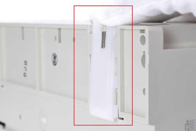 DINレール用の止め具をおさえているツメが四箇所欠けているので、指で押すと止め具が傾きます。(写真参照)